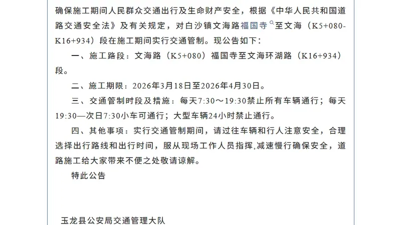 玉龙白沙文海路将施工养护 3月1 ... 2026-3-17 17:05 川湘小碗菜
